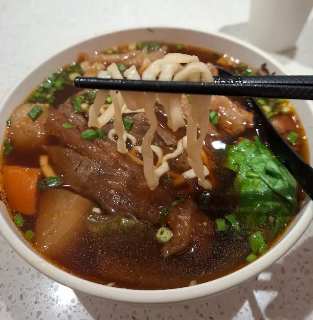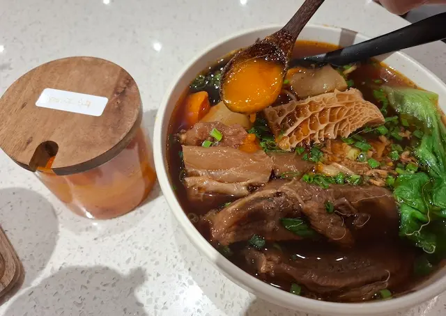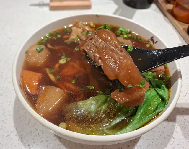 揀選咗兩款人氣湯麵,招牌三寶牛肉麵及半筋半肉紅燒牛肉麵。依碗三寶牛肉麵,湯底濃香,另加咗枱上嘅黃牛油,黃牛油係用咗台灣傳統牛肉麵店常見調味料,係餐廳自家製嘅,混合湯底,飲出每啖都係精華,散發濃郁牛香味 ; 三寶分別有牛肉、牛筋及牛肚 ; 牛肉比想像中厚,食起嚟口感十足,肉質嫩滑,牛味濃郁,牛筋炆至軟身,有些少咬口,牛肚爽滑 ; 麵條彈牙,麵粉香散發出來,配合白蘿蔔、紅蘿蔔及蔬菜,美味嘅牛肉麵必食首選!