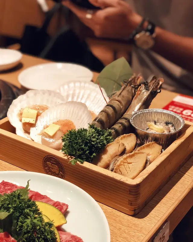 「特別日本產黑毛和牛盛合」(圖2)真心高質,份量多又全部都係厚切,油脂分布平均,完全唔係低質和牛。每塊燒完入口都好好味,口感軟淋又唔會過份油膩,兩個人食完呢個盛合真心唔洗再叫其他任食和牛(圖3)。另外,「豪華浜燒海鮮盛合」(圖4,5) 既巨大虎蝦最令我心心眼,燒完入口好彈牙,啖啖肉!飲品方面,我覺得最好係唔洗加錢有得任飲Asahi 啤酒!