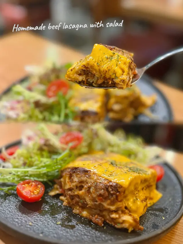 自家製牛肉千層麵,濃郁嘅牛肉醬,口感層次豐富!配有黑醋沙律!