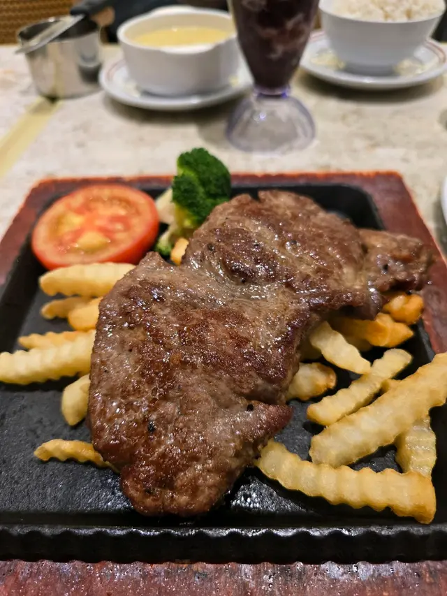 西冷牛扒餐,本來可配焗薯,點知太受歡迎,無晒,只好改薯條,唯有下次再試啦。