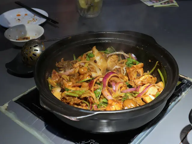 這晚既有雞煲, 又有小食, 超級滿足! 例如冰鎮墨魚鬚 $65, 辣度適中, 墨魚鬚爽口. 尖椒皮蛋$52及手拍青瓜亦是十分受歡迎. 兩款的辣度及爽脆度是佐酒好物!