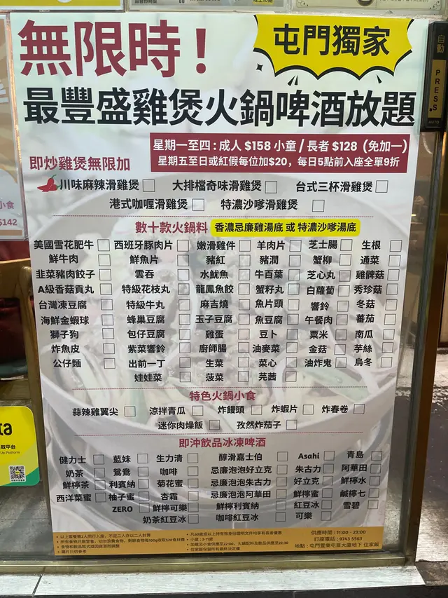 158無限時任食 先食為敬1Level 42025-05-02157 views Follow 屯門呢個小區入面有間茶記依家玩雞煲無限時! 豐盛雞煲火鍋啤酒放題啤酒任飲真係吸引 同成班朋友飲爆佢平日食 成人$158 最緊要係 免加一!其實敏嘉已經越嚟越普遍 希望多啲香港店舖跟!首先點一個即炒嘅雞煲 有六種口味任揀川味麻辣滑雞煲大排檔奇味滑雞煲台式三杯滑雞煲港式咖喱滑雞煲特濃沙嗲滑雞煲香濃忌廉雞湯底我哋鍾意食辣,所以叫咗川味麻辣滑雞煲由於係即叫即炒,而且叫嘅人比較多 所以要點時間雞肉夠滑,入味 食到咁上下加水打邊爐順帶一提,奶茶紅豆冰都係任飲冇限時 食量大嘅人一定好開心19The above review is the personal opinion of a user which does not represent OpenRice's point of view.LikeShare158無限時任食 住家飯 https://s.openrice.com/QrKT0szQjW0Report Post Ratings4Taste4Decor4Service4Hygiene5ValueDining MethodDine In