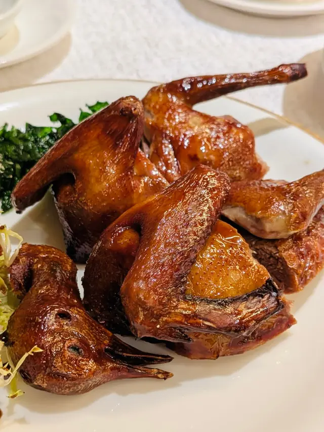 金黃色嘅外皮閃閃發亮,聞落已經有陣陣撲鼻嘅香氣,令人食指大動。佢嘅皮燒得非常脆,啱啱好係嗰種入口即化嘅程度,完全唔會覺得油膩。鴿肉本身非常嫩滑,汁水豐富,咬落去每一啖都充滿肉香。