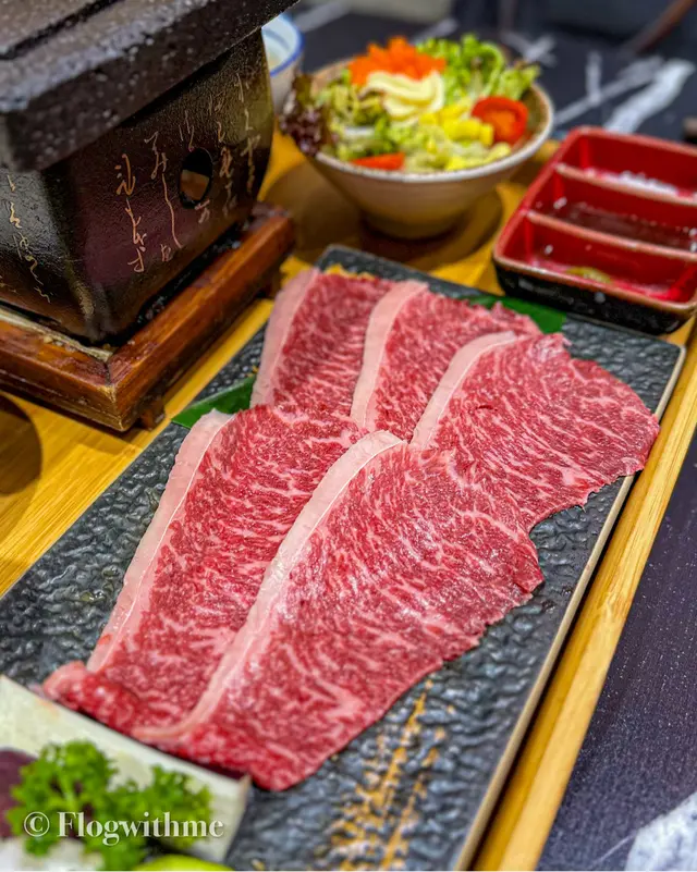 呢到嘅石燒牛提供好多唔同部位選擇,今次揀咗澳洲M9和牛牛肩脊里肉 ($188) 有五大片,片片都好肥美,燒完之後得別香💛 三款調味料入面最鍾意都係岩鹽~ 跟餐仲有日式玄米茶、麵豉湯同埋沙律🥗