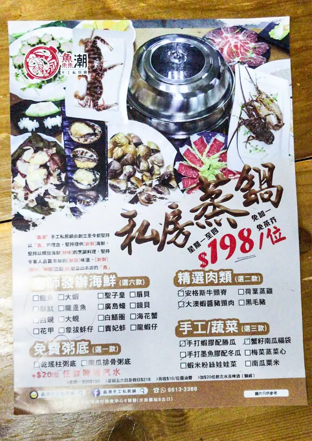 朋友成日話最好一個價錢包晒野食,星期一至四,每位$198,可選擇六款海鮮,兩款肉,三款蔬菜,還有一鍋粥。醬油費$10,但酒水呢就呢度加20蚊可以任飲汽水啤酒!