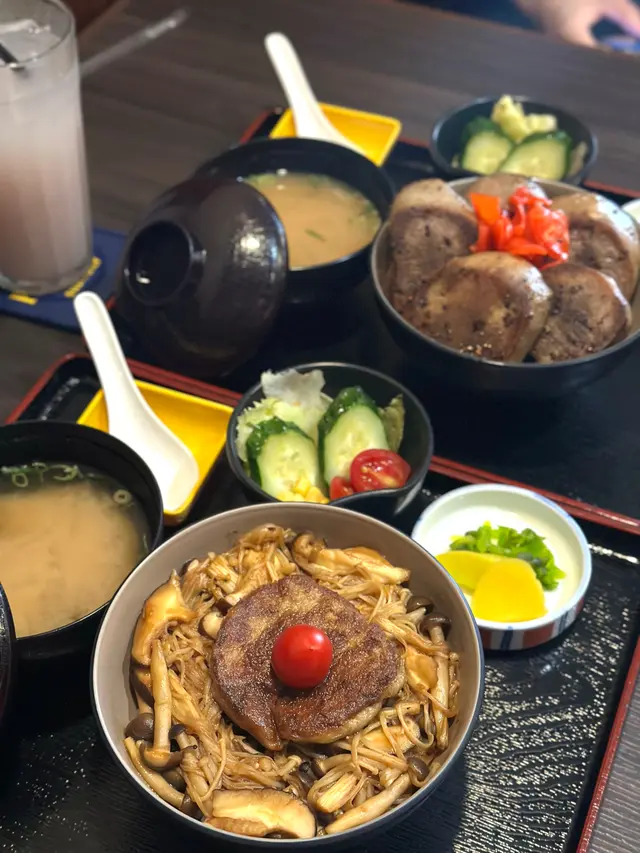飯上有一大塊香煎鵝肝,外層脆脆,裏面充滿油脂香🥰旁邊會有牛油炒菇和甜甜的日式醬汁,超配飯的,好吃😋 野菌種類都好多!另外會配上有沙律、麵豉湯和漬物~