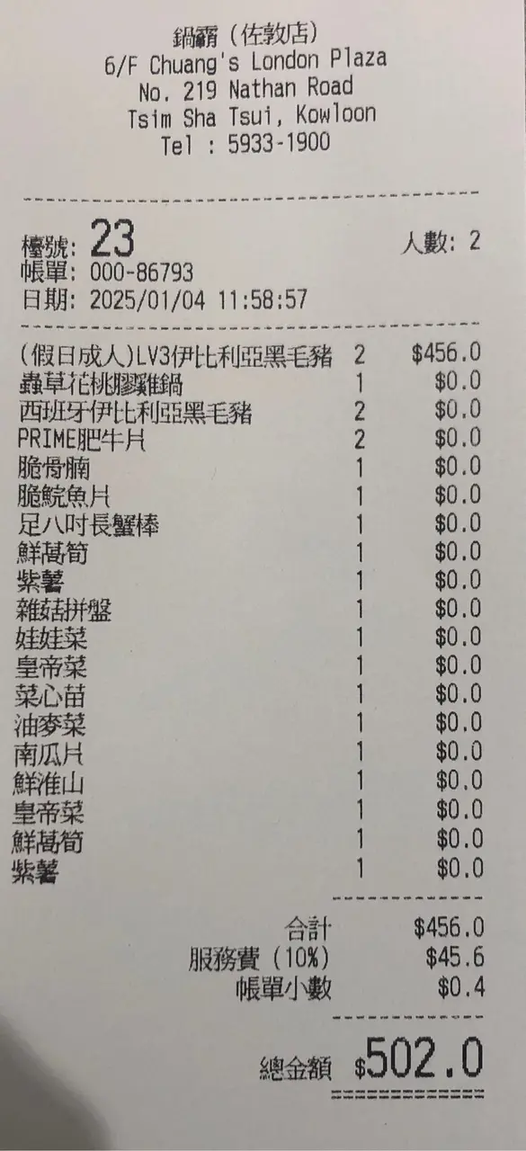 揀左食Lv3,假日會比平日貴$10,埋單兩人$502。食成4個鐘,可以接受。