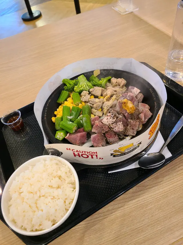 咁我就叫咗一口牛,就跟一碗白飯嘅,同埋我就加咗一份雞同埋一份秋葵,總共埋單就一百蚊多少少咁,整體嚟講都保持到pepper lunch嘅質素 啲肉都幾好食有牛味雞都有雞味咁 價錢上係都可以接受嘅