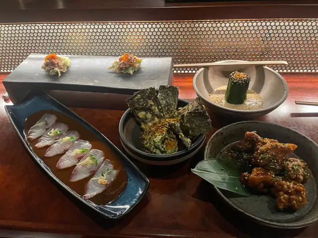 個waitress介紹食spicy tuna tartare, 我唔係好食到辣嘅吞拿魚味因為俾佢既炸紫蘇葉搶晒風頭,不錯不錯。另外新鮮油甘魚配個汁太濃,搶晒Focus,唔知係咪由金魚唔新鮮要用啲汁冚嗰陣味呢?