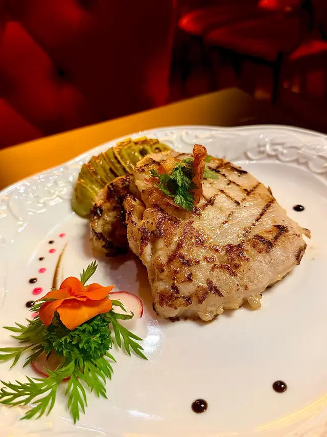 另一主菜慢煮西班牙黑毛豬鞍配焦糖蘋果