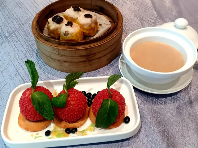 我地叫左上湯焗海蝦伊麵,羊肚菌燒賣,蔬汁金柚雪山包,芋蓉燉鮮奶,北京水餃,妃子笑鹹水角. 原來有白桃,人參,鳳梨烏龍茶,好特別.