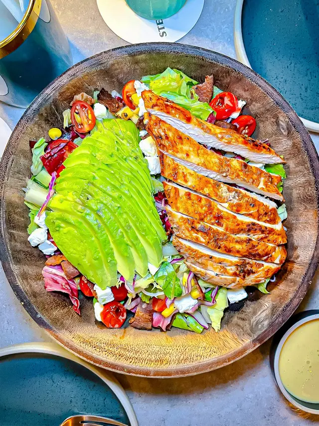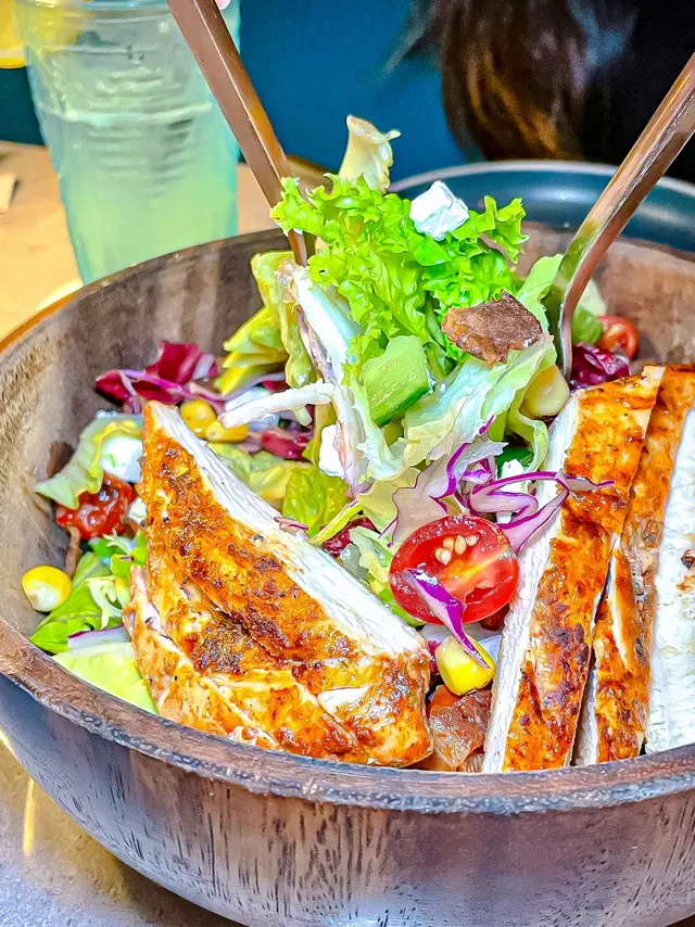 香烤雞肉配上脆口煙肉🥓、牛油果、烤甜粟米🌽、熟成番茄、青瓜🥒、Feta cheese🧀、椰菜同沙律菜🥗,