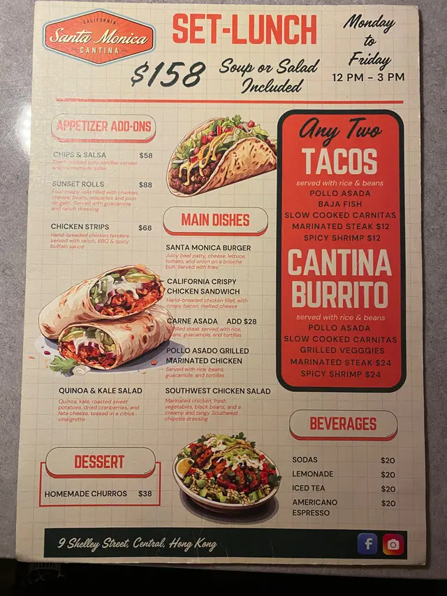 喺中環半山電梯附近,有間開咗1年有多嘅墨西哥餐館——Santa Monica Cantina🇲🇽,行過比佢夠Chill嘅vibe吸引咗而去食lunch🍽️,佢哋主打加州墨西哥菜,嚟到唔可以唔試佢哋嘅特色美食——墨西哥捲餅(Burrito)同夾餅(Taco)🌯,仲有各式各樣嘅燒烤美食🔥,鍾意飲返兩杯嘅呢度仲有好多酒精飲品俾你選擇🍸