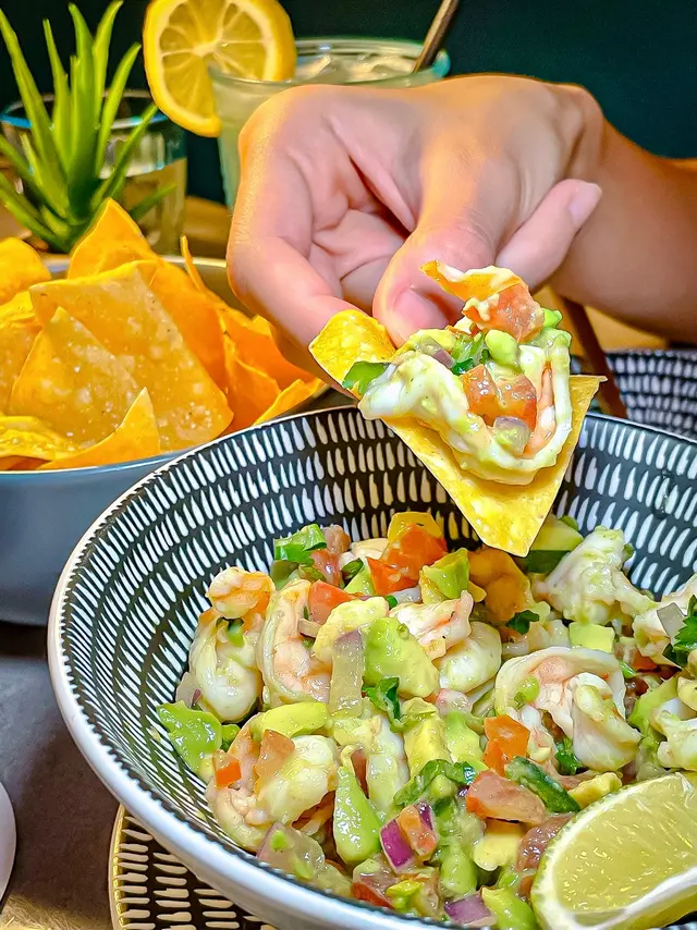 鮮甜大蝦用青檸汁醃製🦐,融合番茄🍅、洋蔥、香菜同牛油果嘅清新滋味🥑,