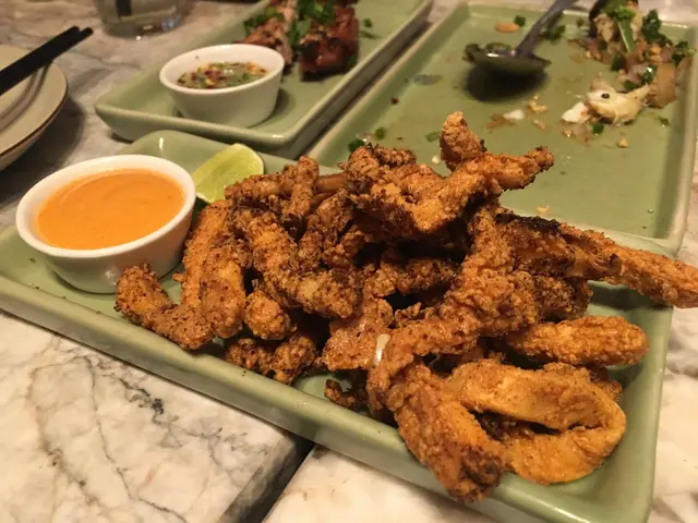 )基本上樣樣都細細碟、好精緻、而且有質素絕對唔係hae整比你。碟beef in Betel leaf好正、牛肉質感好特別、配上沙爹醬超夾;個炸魷魚係必食、送酒之選。我叫左個有香茅味嘅mojito, 幾特別。食食下發生左件小插曲,牆身突然有隻曱甴出現、仲要係曉飛果隻,對於我又唔會有特別不滿,食肆都係眼不見為乾淨㗎啦。食物質素已經掩蓋左呢件事,不過如果留意下衛生情況就更好啦。提返大家呢間真係好多人,七點到已經full哂,九成係鬼佬。有為數不少嘅顧客冇位就直接坐響門囗出面塊大梯級或者立食,如果啲嘢食唔掂鬼有咁墟冚咩!