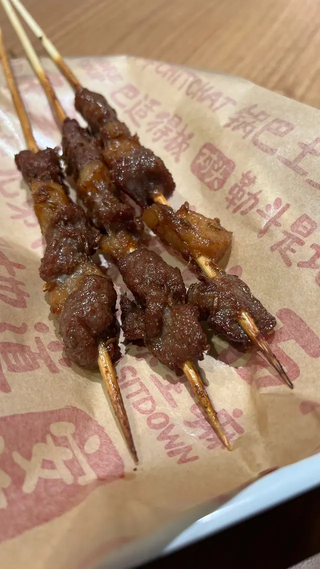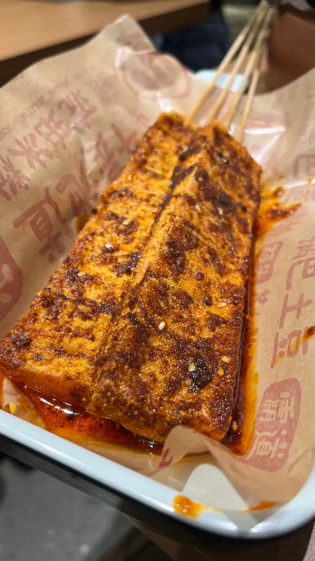 我哋仲試咗羊肉串同爆漿豆腐串。羊肉串唔會騷,肥瘦相間,有肉汁;而個爆漿豆腐串,微辣外皮炸到脆卜卜,入邊豆腐就好嫩滑,讚!
