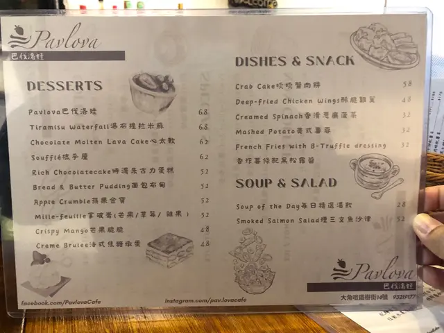 CP 值不錯嘅西餐小店 wong.maLevel 22022-12-11779 views Follow 大角嘴西餐小店 全店可容納10-14人All day set 有好多款揀,豐儉由人。最平嘅餐 $68 有沙律/湯 +主食+飲品沙律用了黑醋,今日餐湯係粟米忌廉湯卡邦尼意粉好掛汁之餘但又未𣎴會太杰身威靈頓牛柳成熟度恰到好處,酥皮好鬆脆,蘑菇醬亦唔會太鹹。原本想點 Tiramisu,可惜暫停供應,店主介紹試吓個心太軟,好吧,試一試。有驚喜,心太軟比外面一般坊間食到嘅不太甜,食完整個都不會覺得滯。店主很健談亦好主動問食客嘅意見。期待下次有機會試到 Tiramisu 🥰31沙律 粟米忌廉湯1卡邦尼意粉$681蟹肉煎餅1蟹肉煎餅 跟餐$421威靈頓牛柳$1782心太軟 跟餐$32The above review is the personal opinion of a user which does not represent OpenRice's point of view.1ShareCP 值不錯嘅西餐小店 巴伐洛娃 https://s.openrice.com/QrKT0UU9600Report Post Ratings4Taste3Decor4Service3Hygiene4ValueRecommended Dishes卡邦尼意粉$68蟹肉煎餅威靈頓牛柳$178心太軟 跟餐$32Date of Visit2022-12-11Waiting Time5 Minutes (Dine In)Spending Per Head$150 (Lunch)