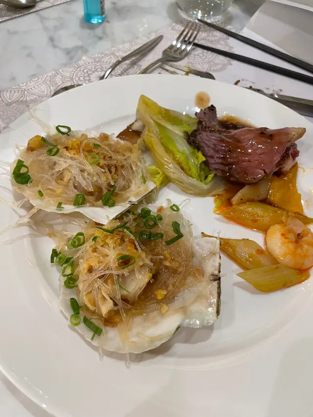 熱食: 牛扒, 羊架有人serve ,有松子魚,紅酒牛柳咁,芋泥帶子,西蘭方炒螺片咁,