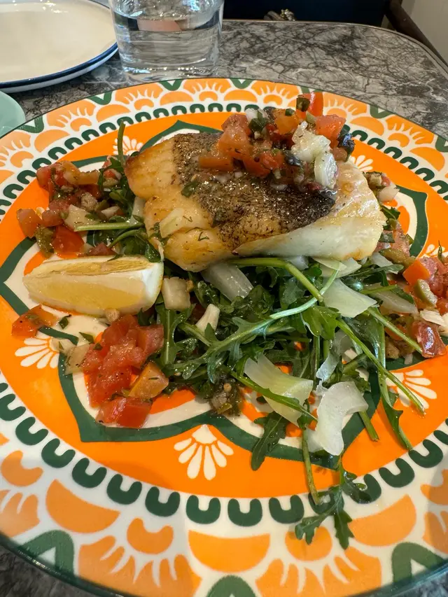 凱薩雞肉配上長葉生菜、番茄和帕瑪森起司。藜麥沙拉配有鮪魚、松子、葡萄乾和石榴。鰈目魚佐青花菜、馬鈴薯和檸檬蒜醬。所有的菜都很美味而且做得完美。