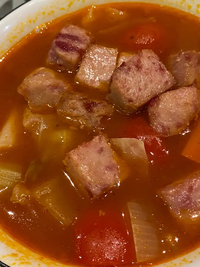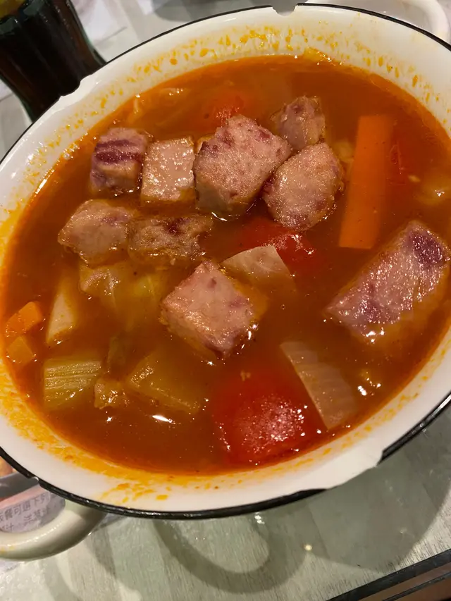醒目既燈箱好有香港特色,不過放工後既我真係好累, 只關心上菜快唔快, 好在無令我失望, 好快就放低左呢碗紅色好SHARP醒既午餐肉粒羅宋湯通粉