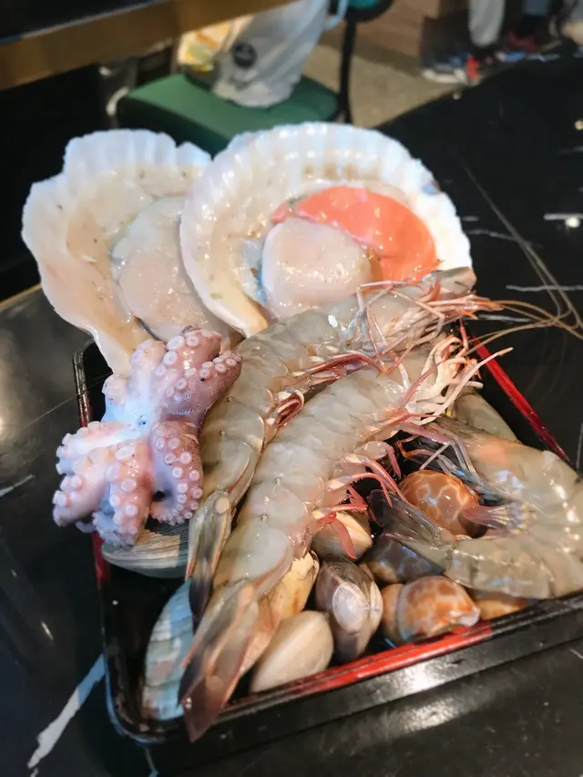 坐底之後我地就揀湯底,佢地有十幾款唔同fusion 既湯底,其實好多都好吸引,我地最後想清d 要左人蔘白玉鍋!無幾耐店員就拎海鮮拼盤同燒烤爐俾我地😋,海鮮拼盤入面有北海道帆立貝,大虎蝦,什蜆,海螺,八爪魚🐙,魷魚,海蝦,全部都好新鮮同乾淨的!