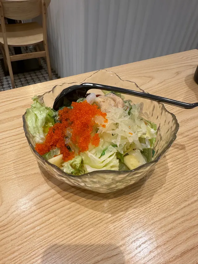 **前菜沙律**:爽脆生菜🥗、飛魚子🐟、海藻🌿、蟹柳🦀、脆片🍘、生蝦🍤、柚子🍋。生菜清甜,吃起來還有爽脆聲,讓人感到非常滿足。柚子的酸甜味非常開胃,整體沙律滿滿的,讓人一口接一口。🍤🦀