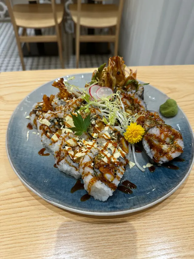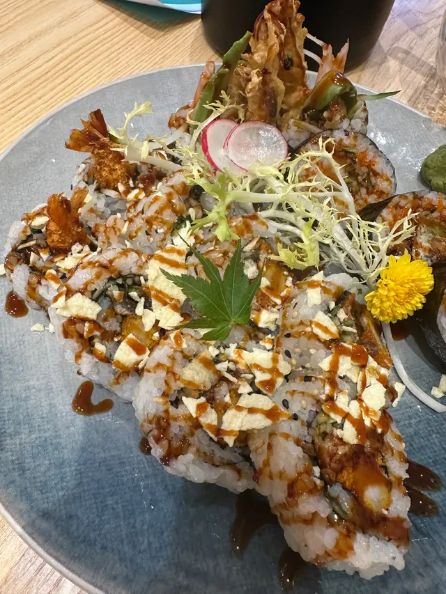 **蜘蛛卷物**:炸軟殼蟹🦀、青瓜🥒、牛油果🥑、蟹柳🦀。外面的醬汁做成了像蜘蛛網🕸️一樣的圖案,味道非常好,讓人每一口都充滿驚喜。🕷️🦀🥑