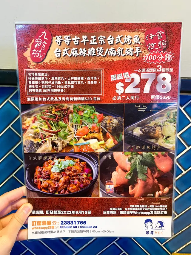 仲有個易拉架,正宗台式烤魚/台式麻辣雞煲/南乳豬手任食放題100分鐘,另外可無限追加,震撼價$278/1人,原價$398/2人,+10%服務費,星期五六日公眾假期都要每位收$20附加費。
