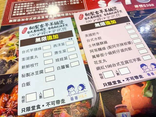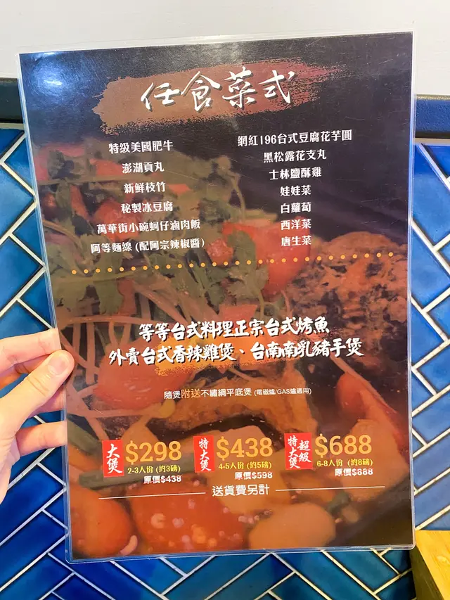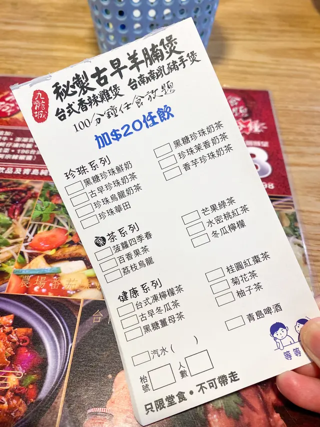 見到紙上寫著另可無限追加特級美國肥牛、澎湖貢丸、士林鹽酥雞、西洋菜、蚵仔滷肉飯、黑松露花枝丸、白蘿蔔、唐山菜、娃娃菜、196台式芋圓、阿等麵線等等,亦可以無限再加台式飲品及青島純啤酒,每位$20