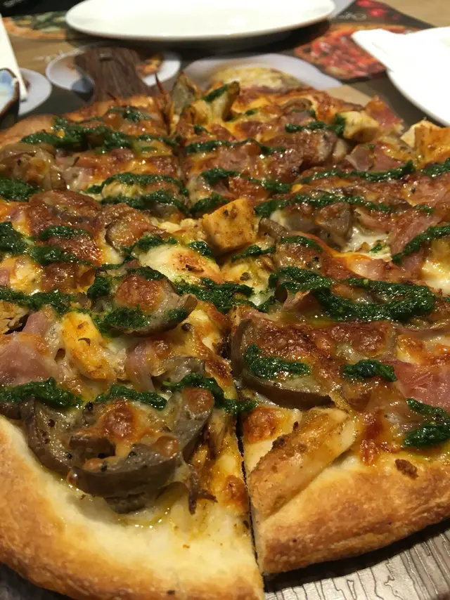 到 Pizza 出場了!我平時不太嗜 pizza,尤其是連鎖店的 PIZZA,我只食1塊,但呢個 9” Pesto Chicken pizza 我倆個人好快KO 哂!有微辣的香辣烤雞,餅底有烤蒜頭、烤茄子,火箭菜,再加上份量剛好的意大利香草醬,所有 pizza 邊是微微的脆,好食到停不了!