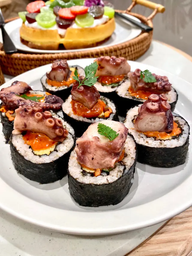韓式泡菜辣醬八爪魚切得大粒又香辣惹味, 紫菜包飯咬落好清爽
