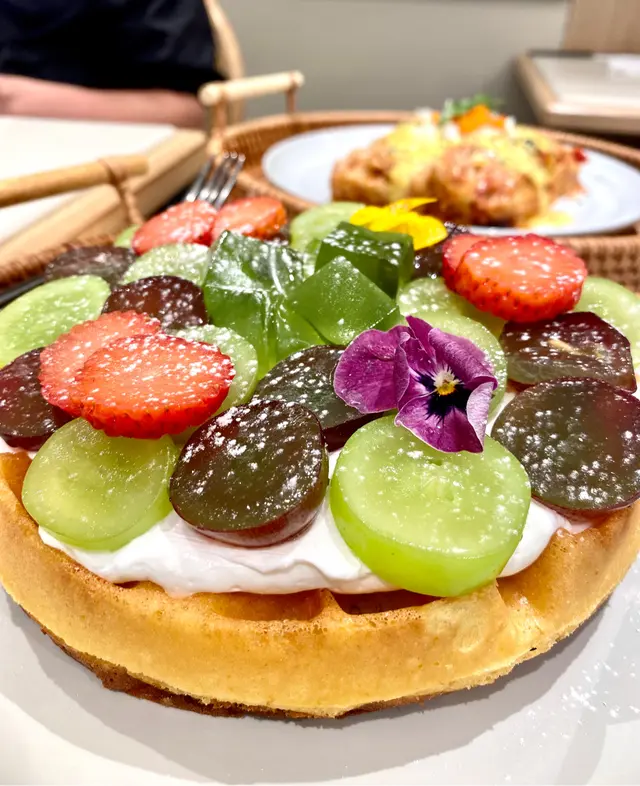窩夫香脆又一咬鬆軟, 上面放滿士多啤梨, 提子, 提子啫喱和食用花, 有齊紅紫綠黃色, 十分IGable!!