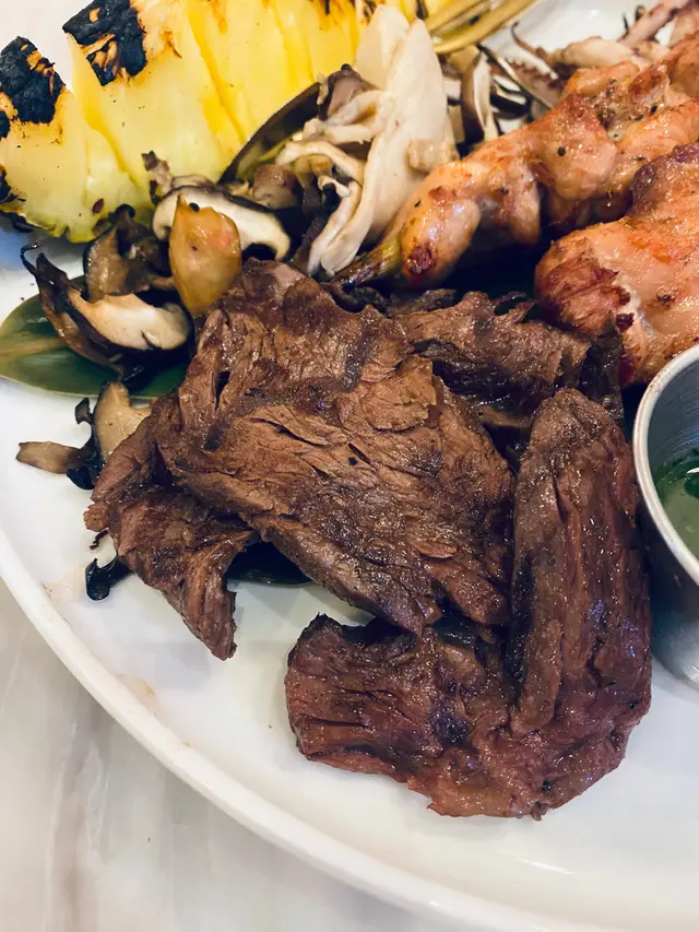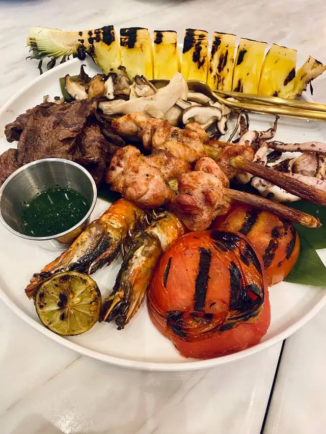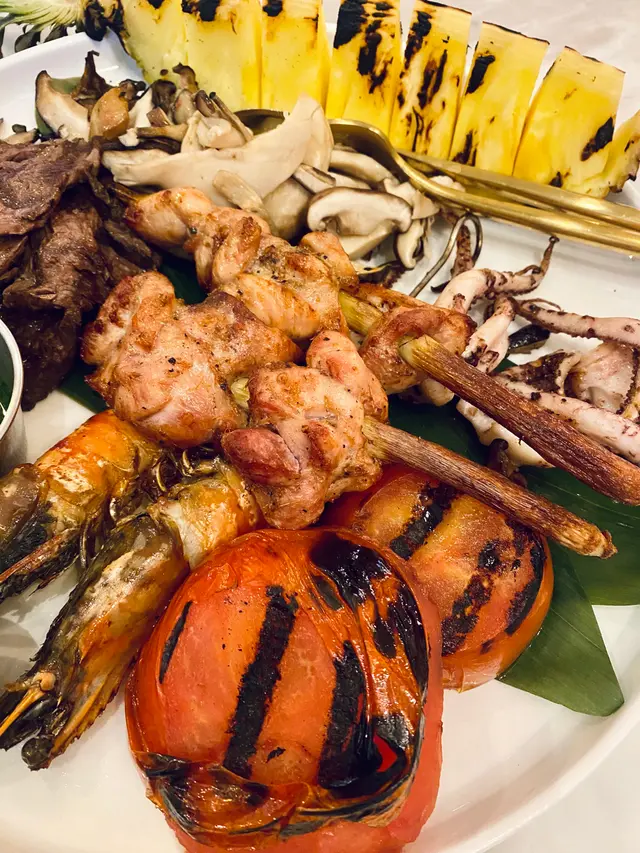 燒烤拼盤,有虎蝦、燒牛肉、魷魚鬚、香茅雞肉串燒、燒菠蘿和雜菌等。