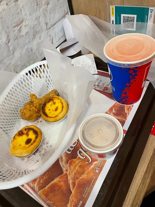 炸雞,薯溶,葡撻,汽水,咁多樣野加埋$26 好似都底喎,行入去用自助機買,我有yuu 積分想換多個葡撻同埋薯格,不過yuu 既野要行去櫃枱度換,好彩同職員講左,原來山東街依間係冇薯格,你真係唔食開都唔知,咁就換左一個葡撻好了,快餐店都唔會有d 咩好大期望,但係我自己個人覺得,佢d 雞好似愈來愈細,還是我個人愈來愈大