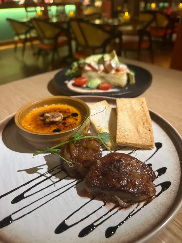 星期一至日,每天都有特定item半價🤩當日係法式鴨肝二重奏🦆必點‼️真心超好食,有兩種食法,一係煎鴨肝擺上多士再襯埋蘋果醬🍎酸酸味味中和左鴨肝嘅油膩;另一種係整到creme brulee,初時好好奇點解有個甜品既?原來焦糖脆脆底下係鴨肝醬黎㗎😍😍😍好難忘,超濃郁☺️