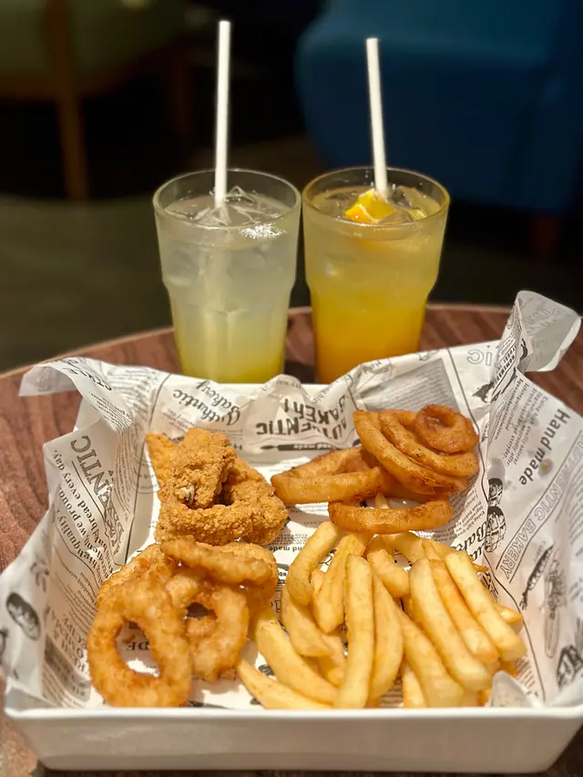 首先黎得Sky Bar,當然要Happy Hour,每人只係$198,已經有一個小食拼盤,兼可以暢飲Free Flow 120分鐘。小食拼盤包括香辣雞翼、炸薯條、脆炸洋蔥圈同埋炸魷魚。一拎上手全部都熱辣辣,最有驚喜係炸魷魚,食得出魷魚炸得脆身而內裏Juicy,肉質都彈牙,最重要係炸粉夠薄。