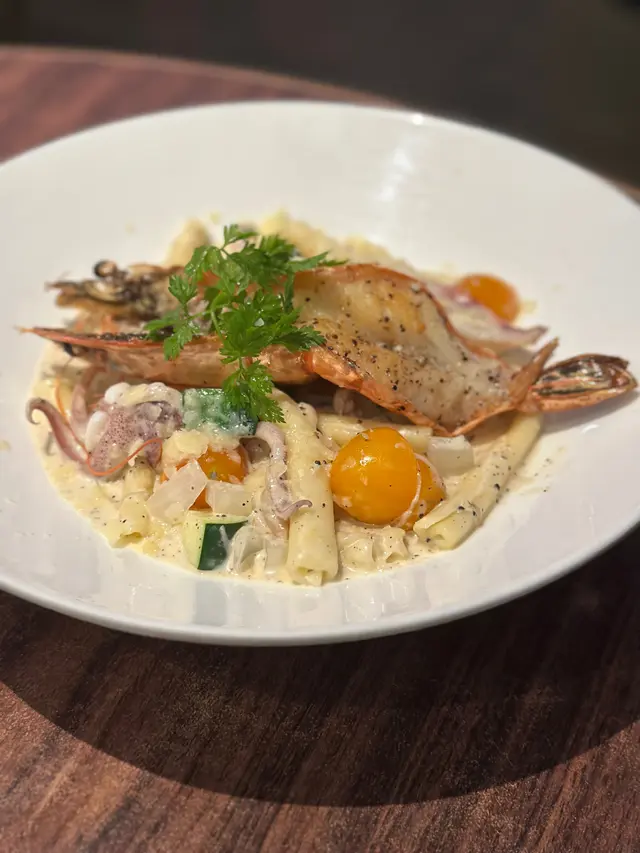 意粉類似Penne但比較細長,做到Al Dente 效果,而醬汁都比較濃稠,做到掛汁的效果。而虎蝦夠大隻,開邊煎得夠香,肉質紥實,另外魷魚份量都多又彈牙。