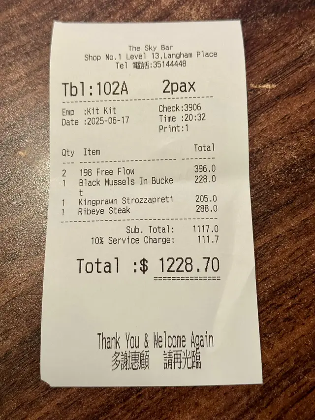整體黎講,本身以為係Bar仲要商場裏面食西餐質素未必好驚喜,但估唔到叫呢幾道菜材料質素都唔錯,調味同配料都有心思,份量又足,環境又舒服。如果大家想搵一處比較遠離煩囂的地方,The Sky Bar或者係你的選擇之一。