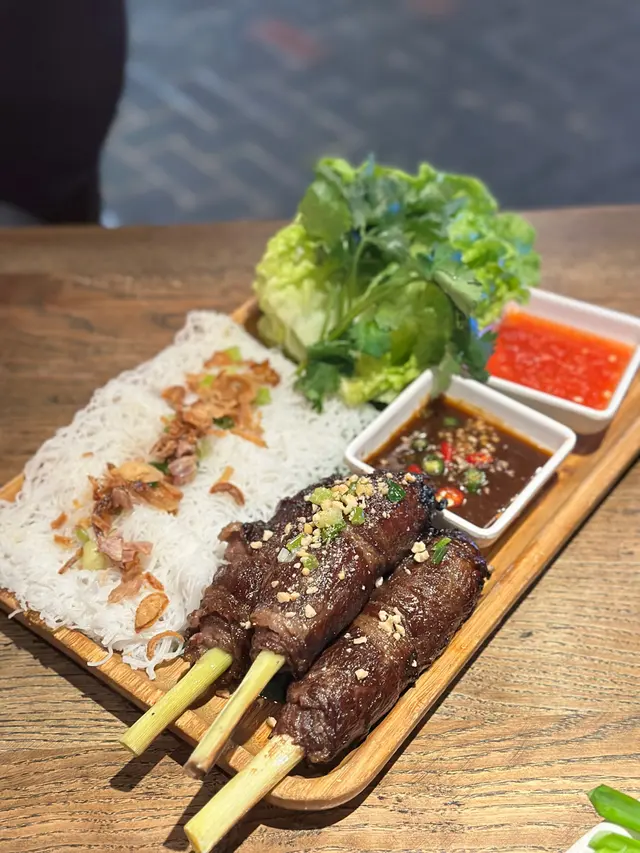 主菜炭烤香茅西冷牛肉都係驚喜菜式之一, 西冷牛肉片中間捲住香茅, 食之前點左個燒汁, 牛肉食落有陣陣既香茅味, 加上仲保留到少少肉汁, 估唔到又幾夾, 旁邊配左個乾蔥蒜檬粉餅, 點個甜辣汁食幾開胃