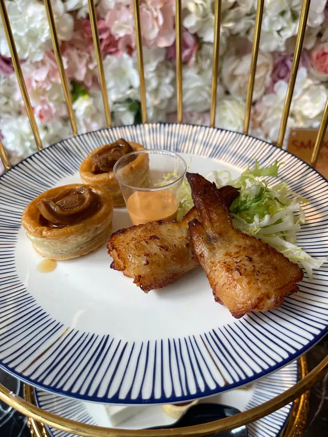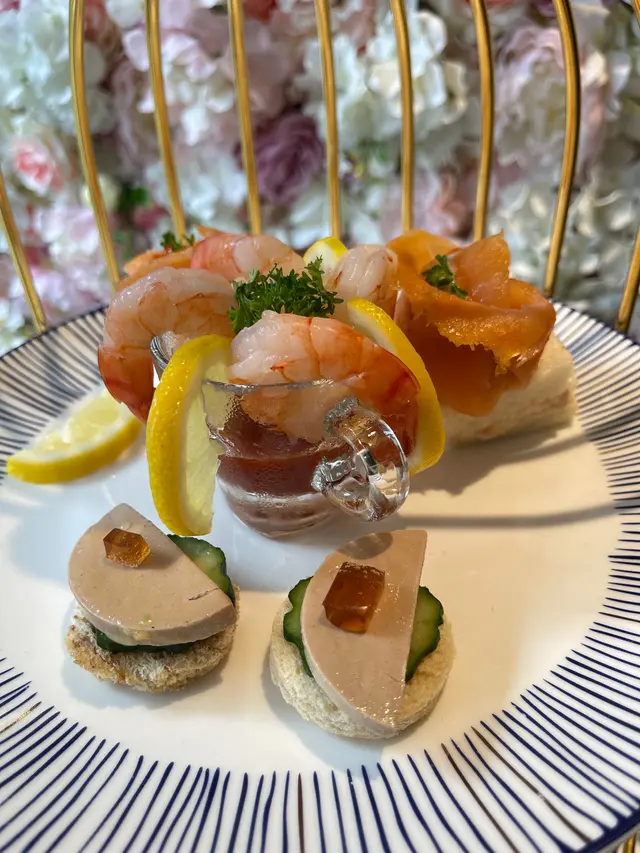 鹹點有三文魚玫瑰卷、鴨肝多士、忌廉芝士蘑菇釀雞翼、雞尾酒蝦同鮑魚酥皮盒🦐