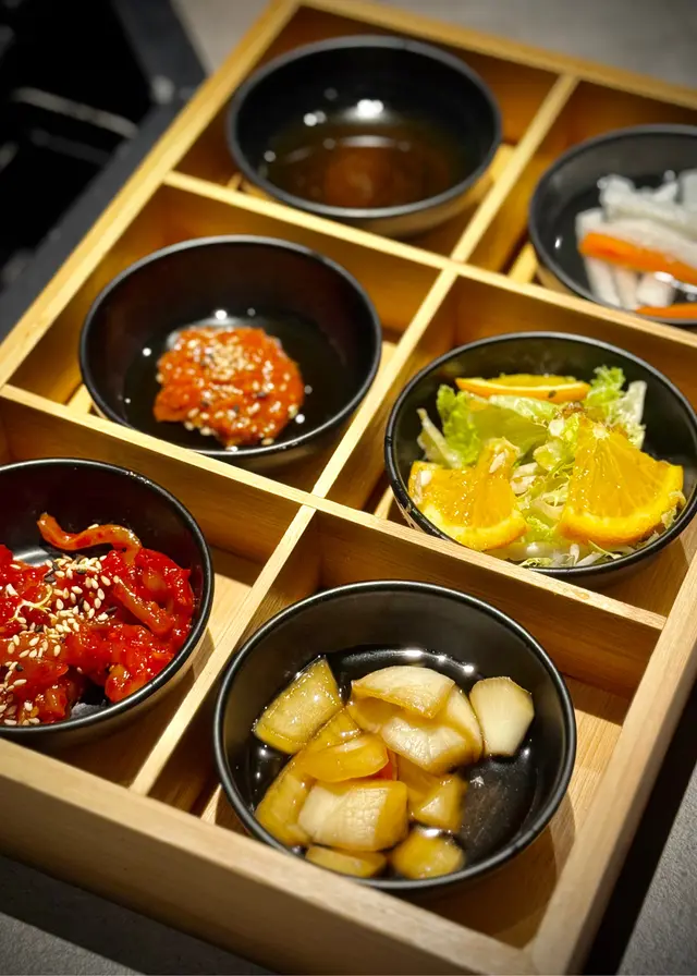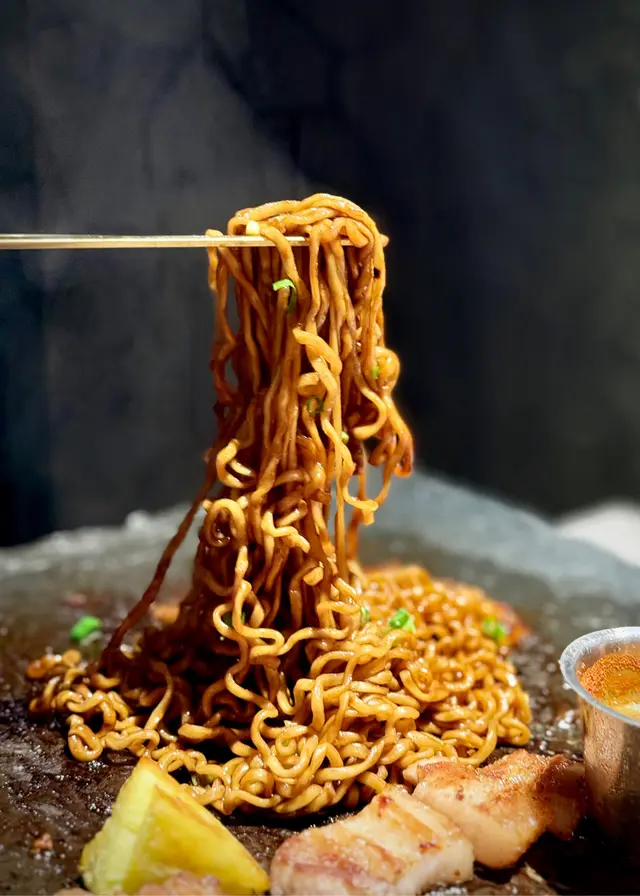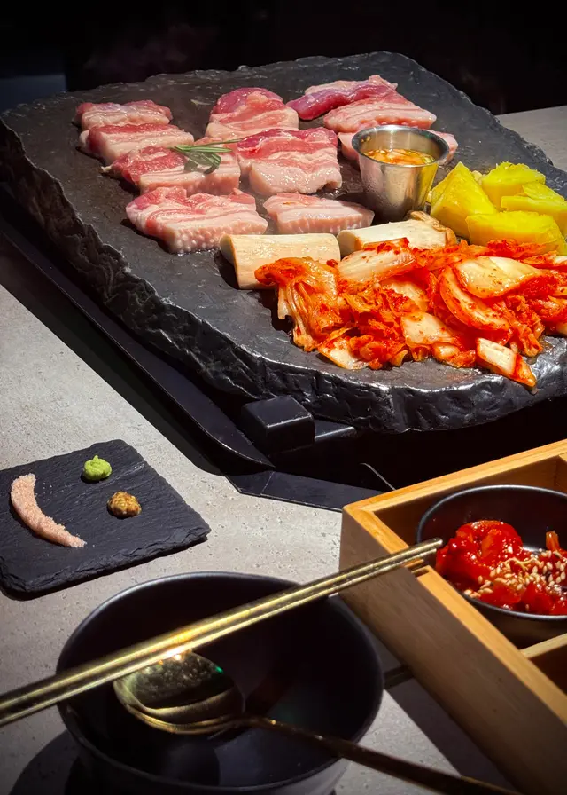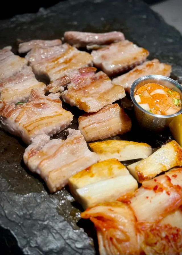 一上枱已經好吸引,五花肉厚切但油脂平均,店員會幫手燒,落鑊時「滋滋」聲超療癒。岩石板燒熱力夠均勻,燒出嚟既五花肉外脆內嫩,唔會太油膩,配埋生菜、蒜片同泡菜一齊食,好正宗韓味!