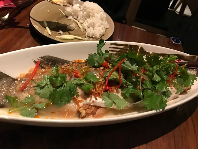 The other main dish was Pla krapong nueng manow, Steamed Sea Bass with three-flavored dressing, lime segments, fried shallots and coriander. If you wonder what exactly is this, this is a high-end version of the Thai style grey mullet hotpot, with the traditional dipping sauce as dressing on the fish. This also was nicely done, with the sea bass being much better than grey mullet, without any mud-taste that sometimes could be found in grey mullet. And because the dressing was on the fish the taste was much stronger as well. One thing however was that the chili was likewise all over the fish and one must be careful or would end up eating the very spicy chili.