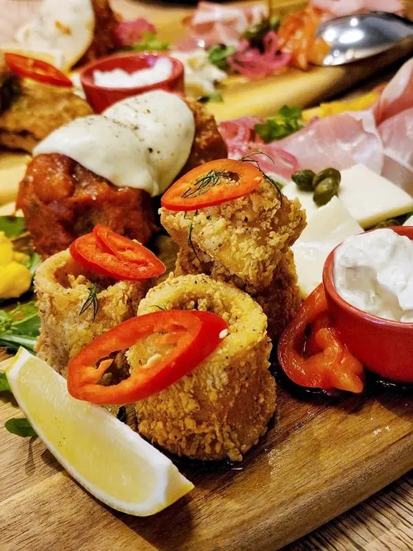 前菜拼盤超級豐富,一板是2人份量,有精選風乾火腿及芝士、羅馬豬肉丸配蕃茄醬及巴馬臣芝士、酥炸魷魚配小酸豆及檸檬蛋黃醬,還有「Breakfast in Tuscany」- 風乾火腿蛋多士。