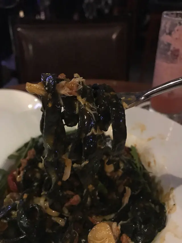 自家製墨魚汁闊條麵,麵煮得未夠有點硬,如果鐘意一啲咬口既人就好合適。