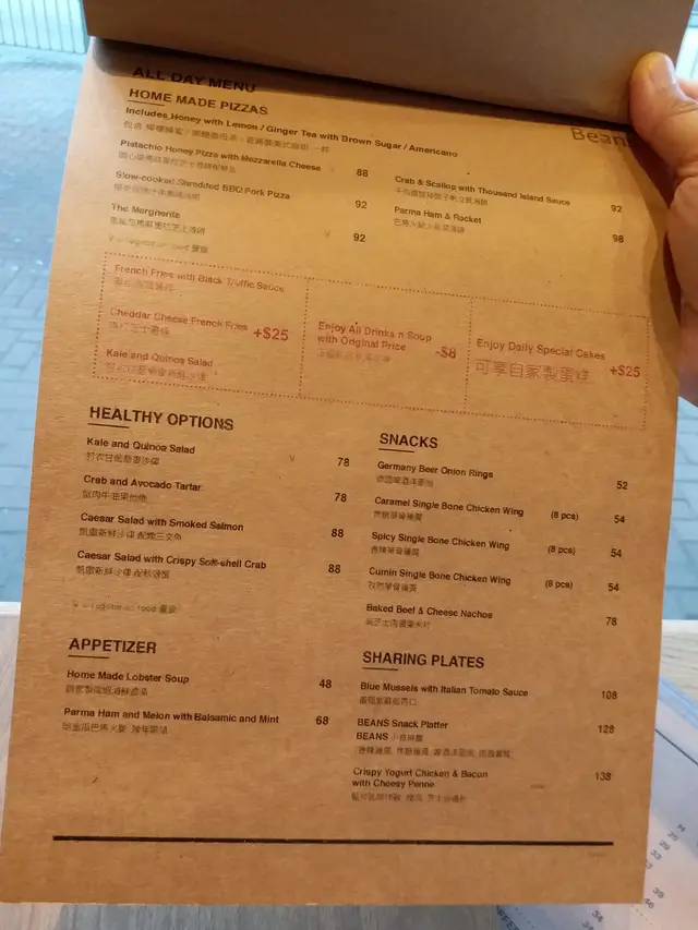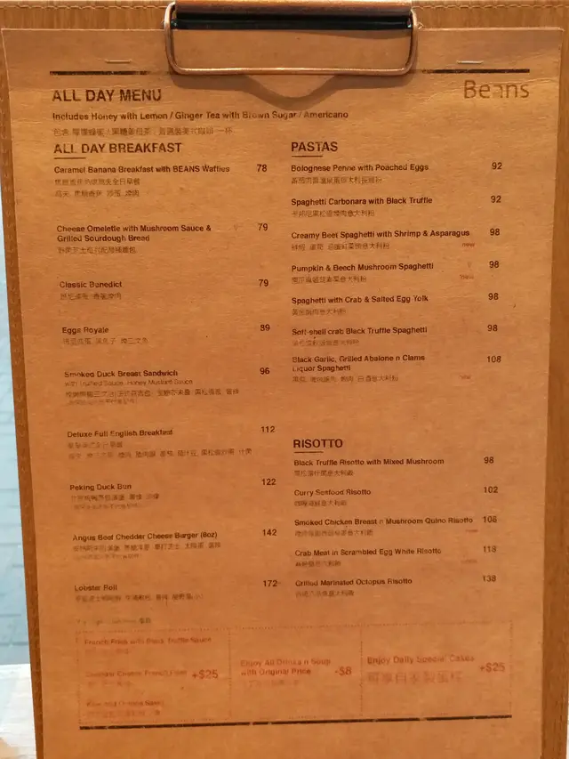 老公決定要$89.00嘅班尼廸蛋,黑魚子,煙三文魚嘅all day breakfast,要減$8.00,變成$40.00嘅自家製龍蝦海鮮濃湯.我要$58.00嘅Green Tea Waffles,有蜂蜜窩夫,蜜燴紅豆蘋果,吉士奶油,綠茶雪糕,香草忌廉同純乳酪同 $39.00一壺,免費refill嘅蘋果肉桂茶.落完單,店長話all day breakfast重有一杯嘢飲包,可遲啲決定落單.