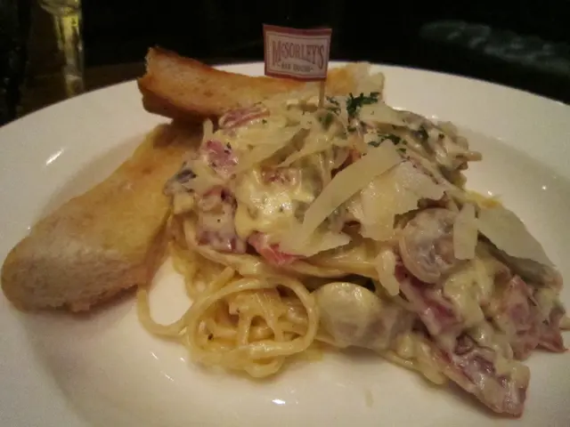 忌廉蘑菇煙肉意粉,插著一支McSorley’s小旗幟,好看得很。配著兩條蒜蓉包,而非一條,細心。我倆口裡嚼意粉,互相點頭說著好味道。蘑菇選貨優質,香濃且沒生澀味,與煙肉及混合雞蛋煮成的白汁互相融合,加上巴馬乾芝士片,稠度剛合掛在麵條上,每一口都濃郁野味。