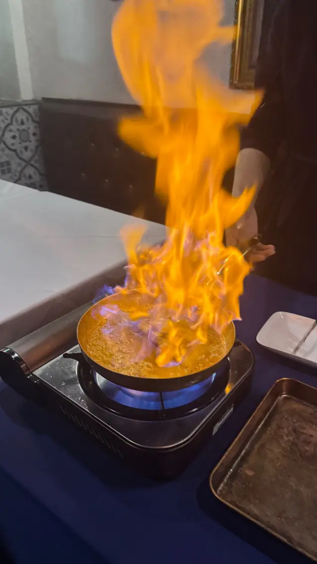 服務員在桌邊點燃班戟的瞬間,火焰升起,增添了視覺上的震撼效果。