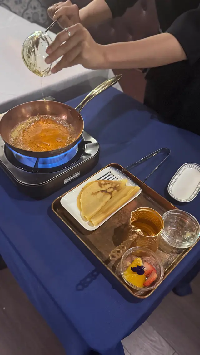 甜品方面,他們的火焰橙酒班戟同樣令人驚豔,搭配橙酒的香氣,微酸與甜味相輔相成,口感層次豐富而不膩。