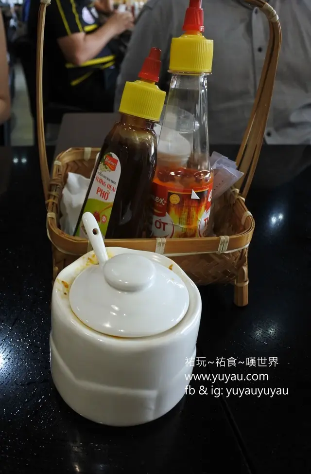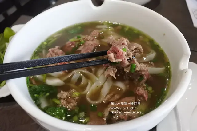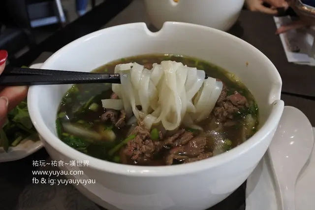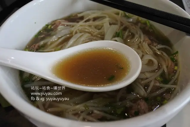 隨生牛河送來的配料小碟上有九層塔、芽菜及青檸,份量都不少呢!牛肉還帶點生,浸一下熱湯生熟度剛好,不過當中有些牛肉有筋很難咬開。牛肉湯是褐色的,入口很清甜,散發住少許香草味。河粉不會一夾即斷,而且份量真的很多,女生可能吃不完。