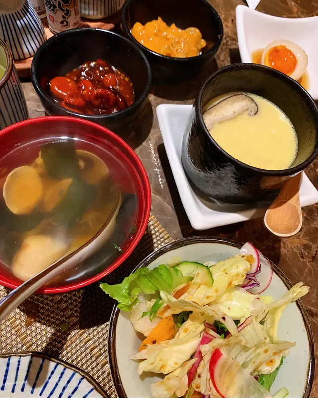 前菜— 螺肉/ 八爪魚🐙/ 溏心蛋 點幾次,茶碗蒸嫩滑,入面海鮮料足,中間叫雜菜沙律🥗清新下。